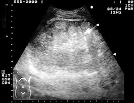 脾実質内に直径2〜3cm大のややエコーレベルの高い腫瘤が,密集して描出されている. |