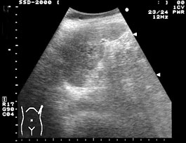 左側背部打撲による脾臓の鈍的外傷(挫傷)の症例. 受傷直後の像である. 脾門部周辺にわずかな実質エコーの乱れがみられるが,損傷範囲ははっきりしない. 腹腔内出血はみられなかった.