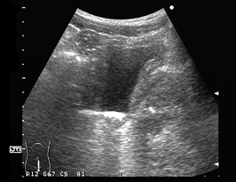 後方エコーの減衰を伴った結石は体位を変えると膀胱内で移動が観察される。膀胱壁に肉柱などの所見があれば尿停滞による膀胱原発結石の可能性を疑う。膀胱憩室や感染があると結石は多発しやすい。 |