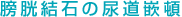 突然排尿障害が発症した症例で、前立腺部尿道に1cm大の結石の嵌頓を認めた。膀胱壁は平滑である。腎結石が落下したものと考えられる。落下結石の大半は自然排石される。 |