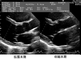 左心房の拡大を認める場合などでは、心尖部四腔断面で長径短径を直接計測する。左心房の拡大は左房圧を反映する事が多いので正確な把握が重要である。